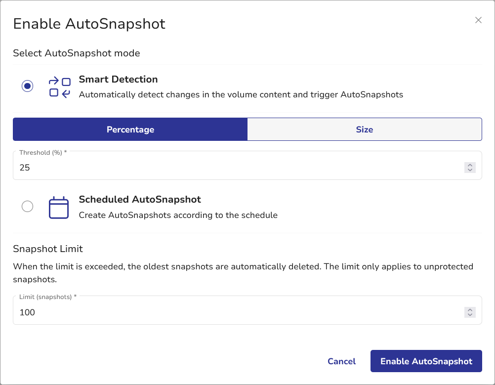 After selecting the appropriate mode and customizing the setting, click Enable AutoSnapshot. AutoSnapshot settings will now be visible in the volume view.