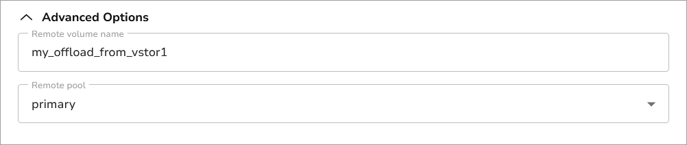 The Advanced Options section allows you to specify a custom name for the offload target volume. If no name is specified, the original volume name will be used.