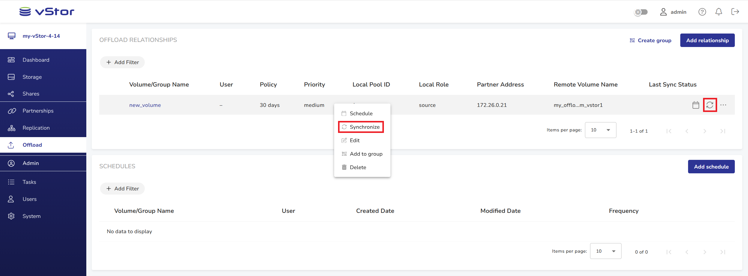 To manually synchronize data between the local volume and the offload target on a partner vStor, hover over the offload relationship record or right-click the record and select Synchronize. The offload operation will be queued for synchronization.
